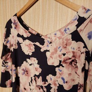 MTS women’s navy floral stretchy top large. Gently used condition. Measurements are: 26” sleeve, 25” from shoulder to hem, and 20” from pit to pit.