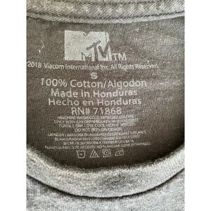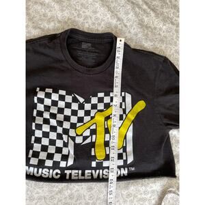 MTV forever. Black cropped MTV “Music Television” tee with a checkered pattern and bold yellow logo. Modern reissue from 2018 with a raw hem for a retro throwback look.