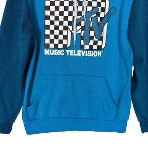 MTV Music Television Hoodie Mens Medium Blue Check Logo Drawstring Pullover. Chest measures 44 inches. Please see all photos for measurements.