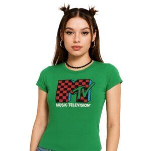Throw it back to the early 2000s with this MTV Music Television baby tee, perfect for fans of Y2K, pop punk, and gothcore aesthetics. This short sleeve, fitted tee features a bold red and black checkered MTV logo on kelly green cotton. It's soft, edgy, and perfect for pairing with low-rise jeans or cargos.