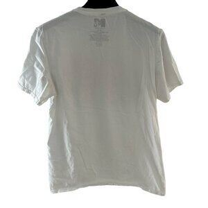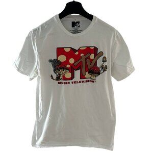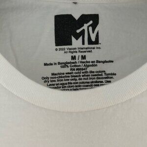 This is an MTV T-shirt in size Medium, designed for Unisex Adults. The T-shirt features a Regular fit with Short Sleeves and comes in a classic White color. The shirt is part of the Music, 80s, and 90s themed collection and is suitable for both men and women.