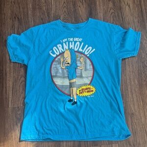 Turquoise tee with Cornholio graphic. Features short sleeves. Fun and casual style.