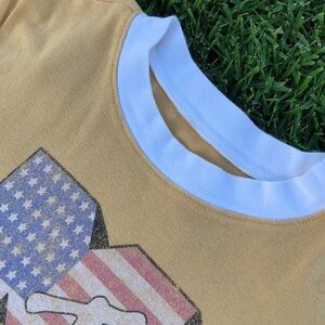 Soft yellow ringer tee with white trim. Front features MTV logo filled with an American flag motif. Tag says large, but fits more like a Womens Medium.