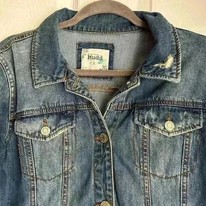 MUDD JUNIOR TEEN GIRLS WOMENS L DENIM JEAN JACKET DISTRESSED BUTTON MED WASH