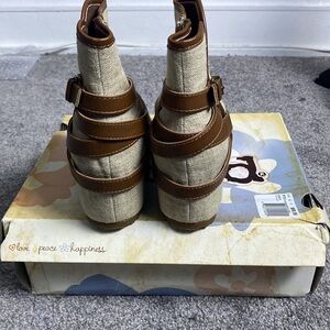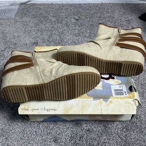 MUDD MDMaikonatural wedge ankle boot, ruched front, inside ankle zipper closure, natural color fabric, brown straps and trim, sz 9M, NIB