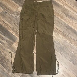 These have zip up to button closure at fly. Deep front rectangular pockets and rear pockets button closed. Belt loops are fold-over for cute detail. Slight wear at back pockets and hem near ankle (see photos). Gently loved; well cared for.
