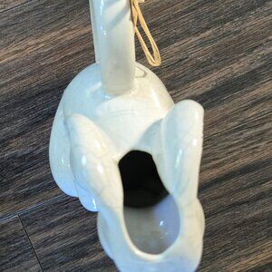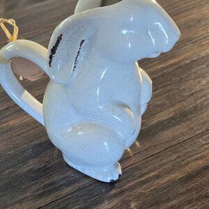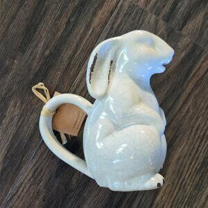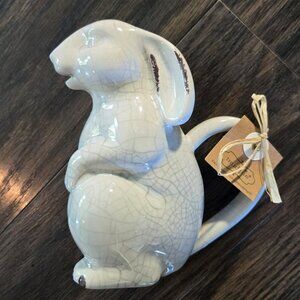 Precious white, standing bunny rabbit watering can OR creamer from MUDPIE. New with tags and in new/excellent quality and condition. Shabby chic/cottagecore style with purposeful crazing. Nice, large, sturdy handle. Liquid can be filled in bunny and will come out through bunny's mouth. Designed to be a small watering can but can also be used for milk/creamer. DIMENSIONS: 6" tall x 5" wide.