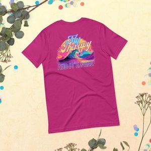 Embrace the therapeutic and liberating spirit of the beach with our MUDPUPs "My Therapy" And It's Free Surf TShirt. This t-shirt is designed for those who find solace and freedom in riding the waves and immersing themselves in the beach lifestyle.
