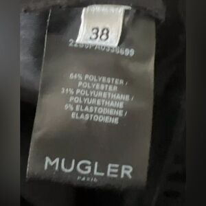 Elevate your wardrobe with these stunning MUGLER leggings. The black shiny embossed jersey fabric is made of a blend of polyester, polyurethane, and elastane, providing a comfortable and elastic fit. The mid-rise waist and ankle length make it perfect for any occasion, whether it's a formal event or a night out with friends.