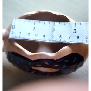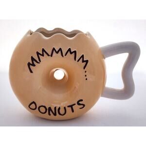 Unique novelty mug that is shaped like a donut. The cup has a see through middle. One side is a chocolate covered "donut" with sprinkles. The other side says " MMMMM ... Donuts". Very cute novelty mug.