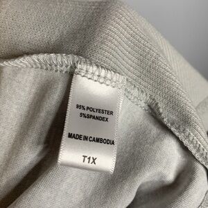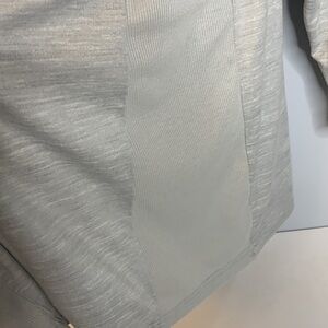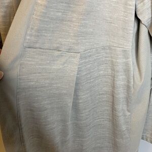 Light gray cardigan 95% polyester 5% spandex. Pleated in front and back. Has stretchy fabric on sides. armpit to armpit 24” Length 35” Excellent condition