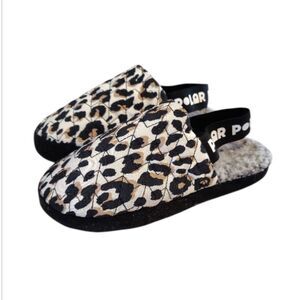 Slip on with stretch "POLAR" print slingbacks. Quilted, leopard prints (cream, brown & black). Fuzzy, sherpa lining, with memory foam footbed/ insole. Indoor/ outdoor TPR sole.