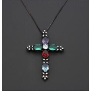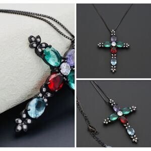 UNIQUE DESIGN - a beautiful cross pendant necklace filled with multicolored gemstones over an antique tone metal alloy base