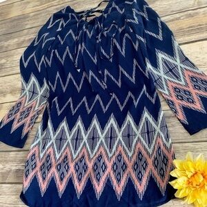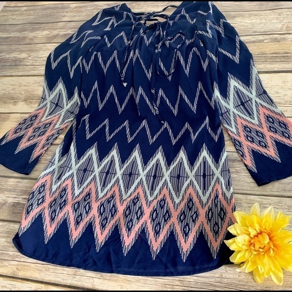 XHILARATION. Size xs. Navy long sleeve dress with multi color stipe design. Bell sleeve. Tie top closure. Very flattering. 33” length. Sleeve length 22”. Lined. 100% polyester.