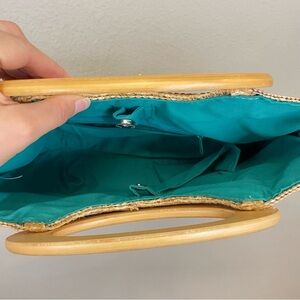 Smooth oval wood handles, magnetic button closure, inner pockets.