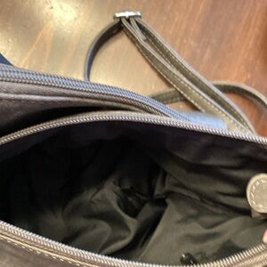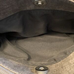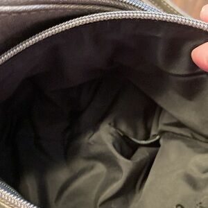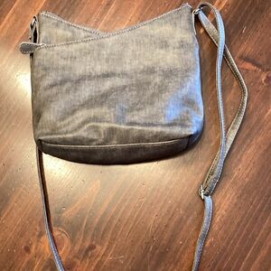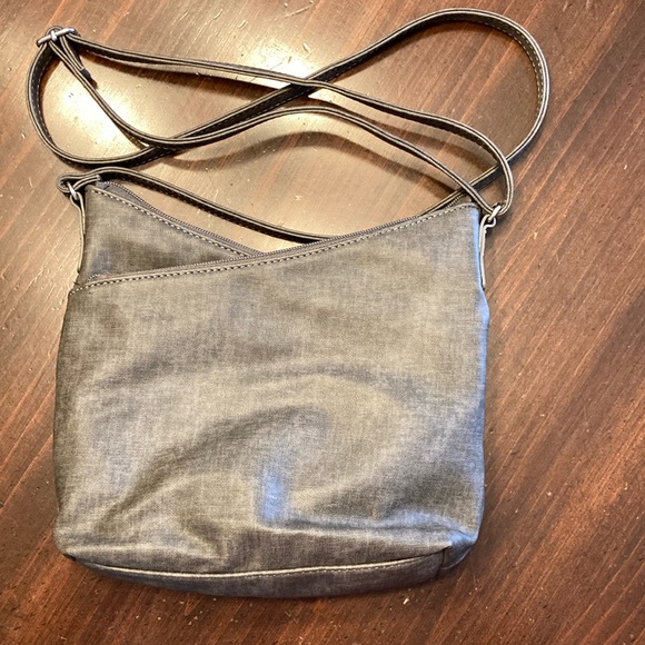 new grey cross body purse lots of pockets which includes a pocket for cell phone inside