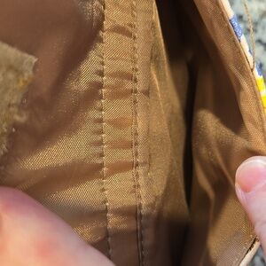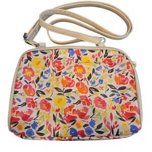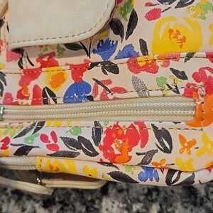 Pre-owned. Very good condition. This crossbody has a ton of zippered pockets. 3 on the outside. Flapover closure pocket on the front. 3 top zip pockets to hold all of your things. Interior change purse. 6 card holders. Very clean interior. Adjustable crossbody strap.Floral design.
