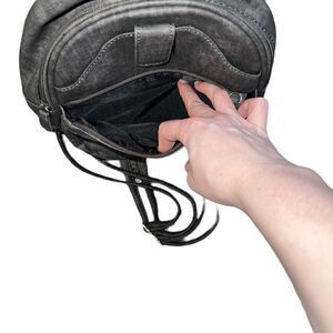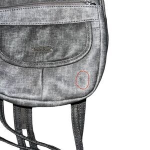 MULTISAC Grey Backpack. There is a small dent on the bottom right side of the back which is circled in picture 4