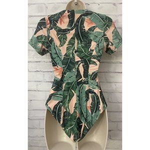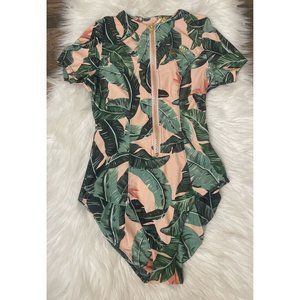 MUMU Barbie pipeline zip front Beverly swimsuit pink and green banana leaf pattern Sz small.