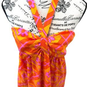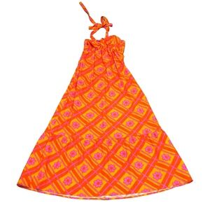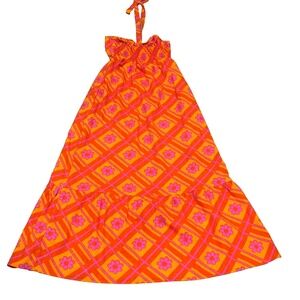 MUMU x Barbie Long Halter Sundress with Ruffle; Orange/Pink/Floral; Size Medium