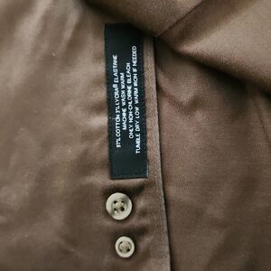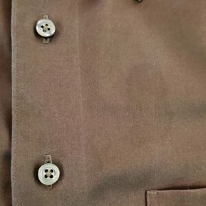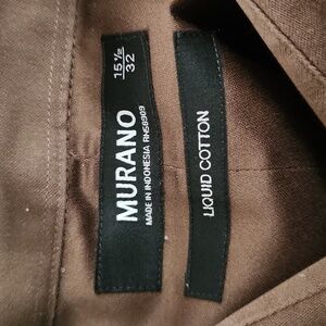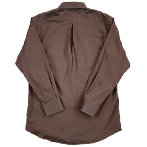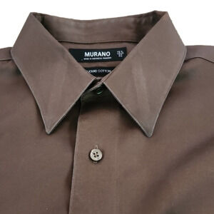 Brown Murano Liquid Cotton long sleeve button-up dress shirt. Size 15.5/32. 97% Cotton, 3% Lycra Elastane. Some flaws can be seen in pics, no tears or holes. In good overall condition.