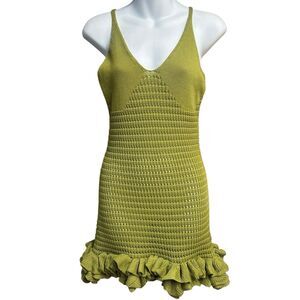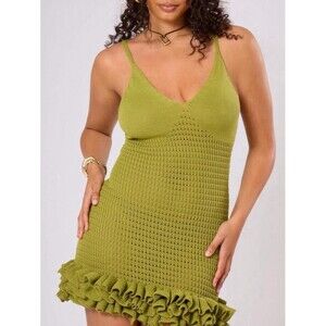 MUSERA Mini Dress Large Green Sheer Crochet Knit Frill Hem Summer Vacation Beach