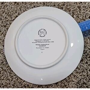 The plate is made of porcelain and was produced in France using traditional art pottery techniques.