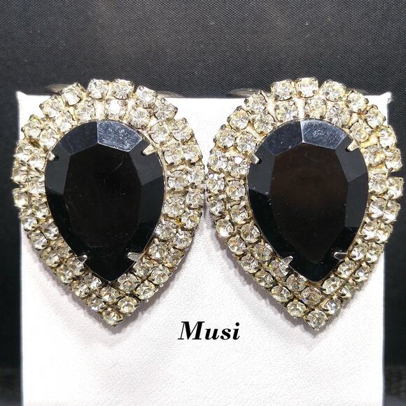Add a touch of vintage glamour to your shoes with these classic MUSI vintage shoe clips. Each clip features a large black teardrop-shaped faceted glass stone at the center, framed by two rows of brilliant clear rhinestones. All stones are prong set, ensuring sparkle and security. The clips are signed MUSI on the back of the clasps and remain in excellent working condition. These versatile pieces can also be clipped to handbags, scarves, or hats to create a unique, personalized look.