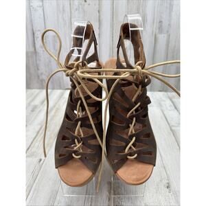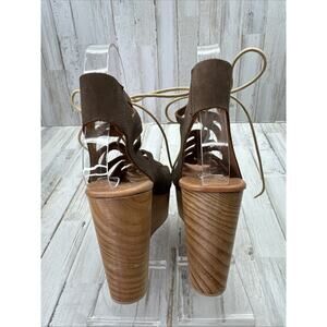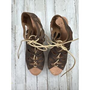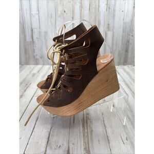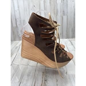 MUSSE & CLOUD Brown Nubuck Leather Lace Up Wooden Platform Wedge Sandals 39/8 Made in Spain. Boho Chic! Festival approved!