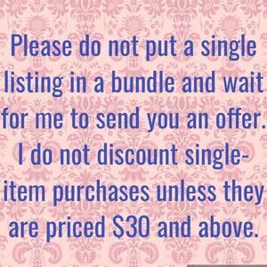 BUT... please don’t put just ONE ITEM in a BUNDLE and wait for me to send u and offer. If you do, you will be waiting for nothing ... cause an offer will never come. I DO NOT DISCOUNT OR SEND OFFERS ON SINGLE ITEM PURCHASES OF ANYTHING PRICED BELOW $30.