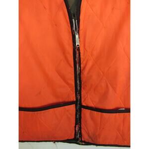 Brand: Scovill Reversible camo print & safety orange Size: L/XL Approx. 22.5-inches across the front of the chest, pit to pit Approx. 23-inches in length from mid shoulder to bottom hemline Condition: loose threads & damage to the fabric trim on the orange side The orange side has pockets Metal zipper in center