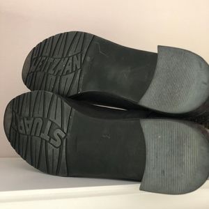 Black leather with grey metallic tweed upper and slight lug sole.