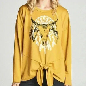 SO Comfortable, this Long sleeve scoop neck bull print tie waist top is easy to pair with jeans and booties
