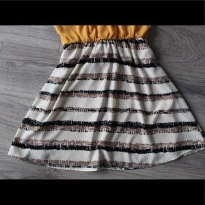 mustard top with eyelet back, skirt is cream base with brown and black detail horizontal stripes. Size small. Elastic waist with a bow that ties around the waist. there is a small stain that lightens the time of mustard on the upper left of top. shown in second image.