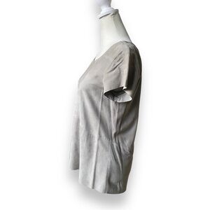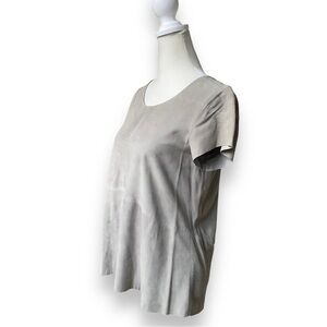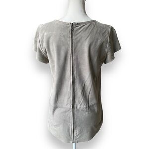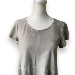 Muubaa Sean Suede T-Shirt in Mist (gray/taupe) Size 6. Edgy but easy to wear, this suede T-shirt is a summer classic. The Muubaa Sean Suede T-Shirt has cap sleeves, a round neck, dipped back hem, centre and waist seam detailing, a flattering, hip-skimming flare and a sexy separable exposed zip at the back.