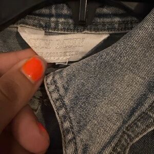 Stylish denim cropped jacket / shacket in classic blue. No size tag, but PTP is 18” and stretches up to 22”. Used but in good condition! Comment with questions!