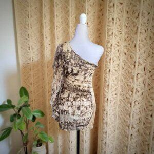Step out in style with the MUlTI TAN OFF THE SHOULDER DRESS size XS. Tailored to accentuate a 28-inch bust and 26-inch waist, its 32-inch length offers a flirty, fun vibe. Adorned with elegant touches of gold, this dress effortlessly blends sophistication and playfulness—ideal for dancing the night away while turning heads.