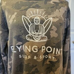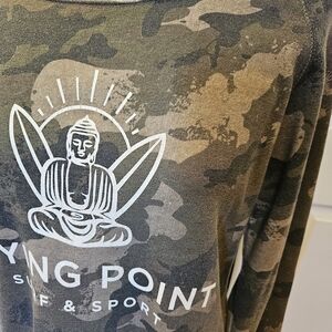 MV Sport Flying Point Surf & Sport Camo Sweatshirt size L. Stylish camo sweatshirt. Features Buddha graphic design. From surf and style shop in the Hamptoms. Flying Point beach. Southampton.