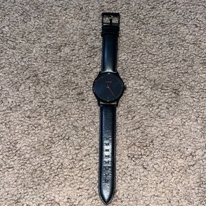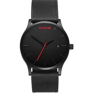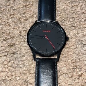 MVMT Black Leather 40 Series Watch 40mm. MT01-BLBL. Lightweight and versatile, this watch defines simple sophistication. Black dial with dark grey line markers and red dial accent. Flat mineral glass. Black leather strap. This version of the watch does not have a date box. Please note strap is interchangeable. Watch is approximately 9.75” long. Great pre-owned condition. Normal signs of wear to be expected with light scratching and creasing. Please note watch needs a new battery. Smoke/pet free home. Offers welcome. Bundle & save. Ship same/next day. Packaged w/ care.