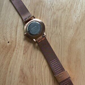 38mm. Rose gold face, bezel and metal braclet. Fully funtioning, needs battery.