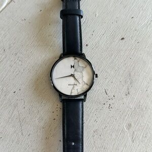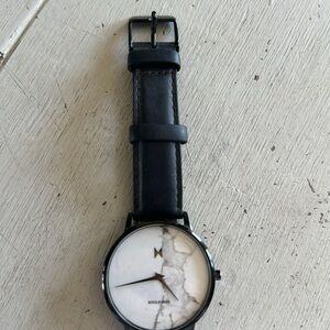 Enjoy V Nice & Very Unique Looking Mvmt Classic MB01-BLBLMA Watch With 38mm White Marble Face With Grey Grains & Black Hands & Black Bezel & Black Leather Band.