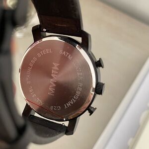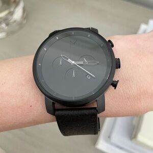 MVMT Mens Sleek black watch with a minimalist design. Features a black leather strap and a simple dial. Great used condition! Don’t see any noticeable flaws at all