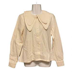 This unique blouse is made from 100% recycled cotton yarh. The accent for this design is on the double collar details, having a combination of round and triangle shapes.