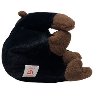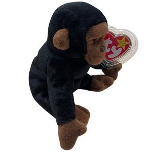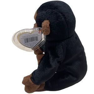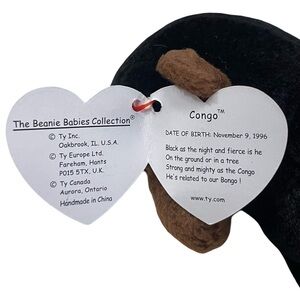 Adorable Ty Beanie Baby monkey plush. Features black and brown colors. Perfect for collectors and kids. "Congo" the Gorilla Beanie Baby, produced by Ty Inc. This particular Beanie Baby was first introduced on November 9, 1996, and later retired. It's characterized by its black plush body, brown face, hands, and feet, and the signature Ty heart-shaped tag attached to its ear. The tag visible in the image is likely the 4th generation hang tag, which was used around 1996-1997.