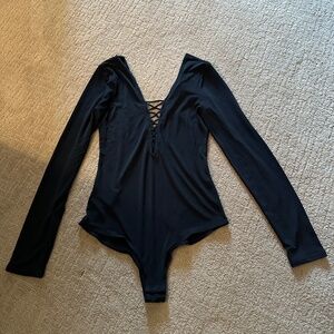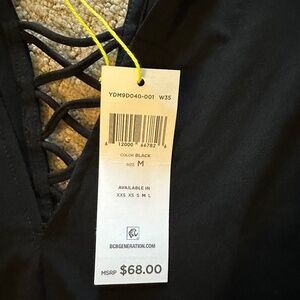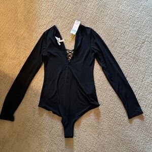 MWT BCBGeneration Deep-V Crisscross Front Bodysuit Black, Size Med.