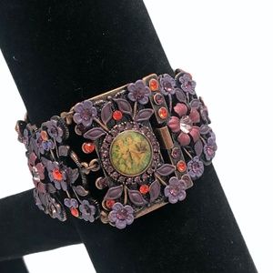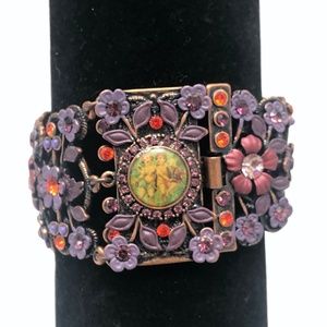 Vintage MX light pink, purple, and red enamel and crystal bracelet is in excellent preowned condition. It is bronze tone metal with pink, purple, and red flowers and leaves. The clasp has a pair of cherubs surrounded by purple crystals. 7”L x 1.25”W