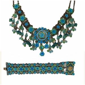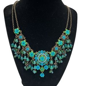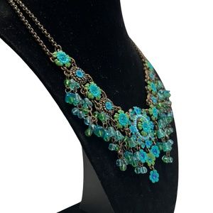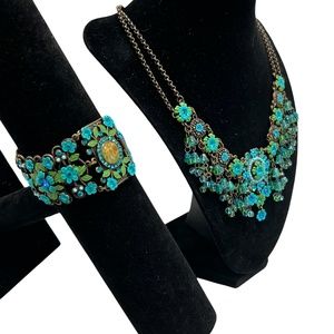 Vintage MX turquoise and green enamel and rhinestone flower matching bracelet and necklace in bronze tone. Both in very good preowned condition. Each has turquoise enamel flowers with bright green and blue rhinestones. The bracelet has a disc with cherubs surrounded by bright green stones. The necklace has dangling crystal beads in shades of green. Bracelet- 7”L x 1.25”W. Necklace- 17”L with 3” extender.