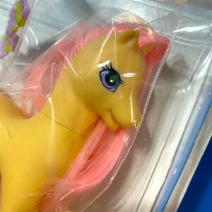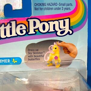 My Little Pony G2 Vintage 1997 Secret Surprise Friends Sky Skimmer Pony & Accessories In Original Package by Hasbro, Sky Skimmer Pony Has A Yellow Body, Pink Hair, Pink Outline Of A Butterfly Symbol, Purple Eyes w/Sparkle, A Pink Comb, (2) Purple & Green Butterfly Barrettes & (4) Aqua Foot Rings, Contents Are COMPLETE Packaging Has small piece cut out and no plastic insert, Package Size 10”x7” RARE FIND