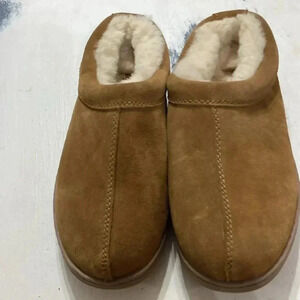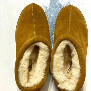 MY SLIPPERS MENS SIZE 7WIDE CARAMEL BROWN LEATHER SLIPPERS FAUX FUR LINING CLEAN VERY GOOD CONDITION