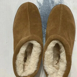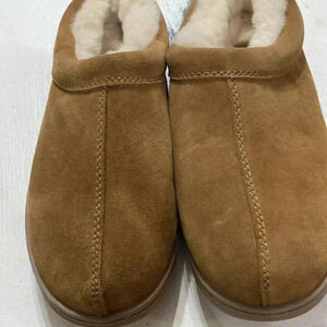 MY SLIPPERS MENS SIZE 7WIDE CARAMEL BROWN LEATHER SLIPPERS FAUX FUR LINING CLEAN
